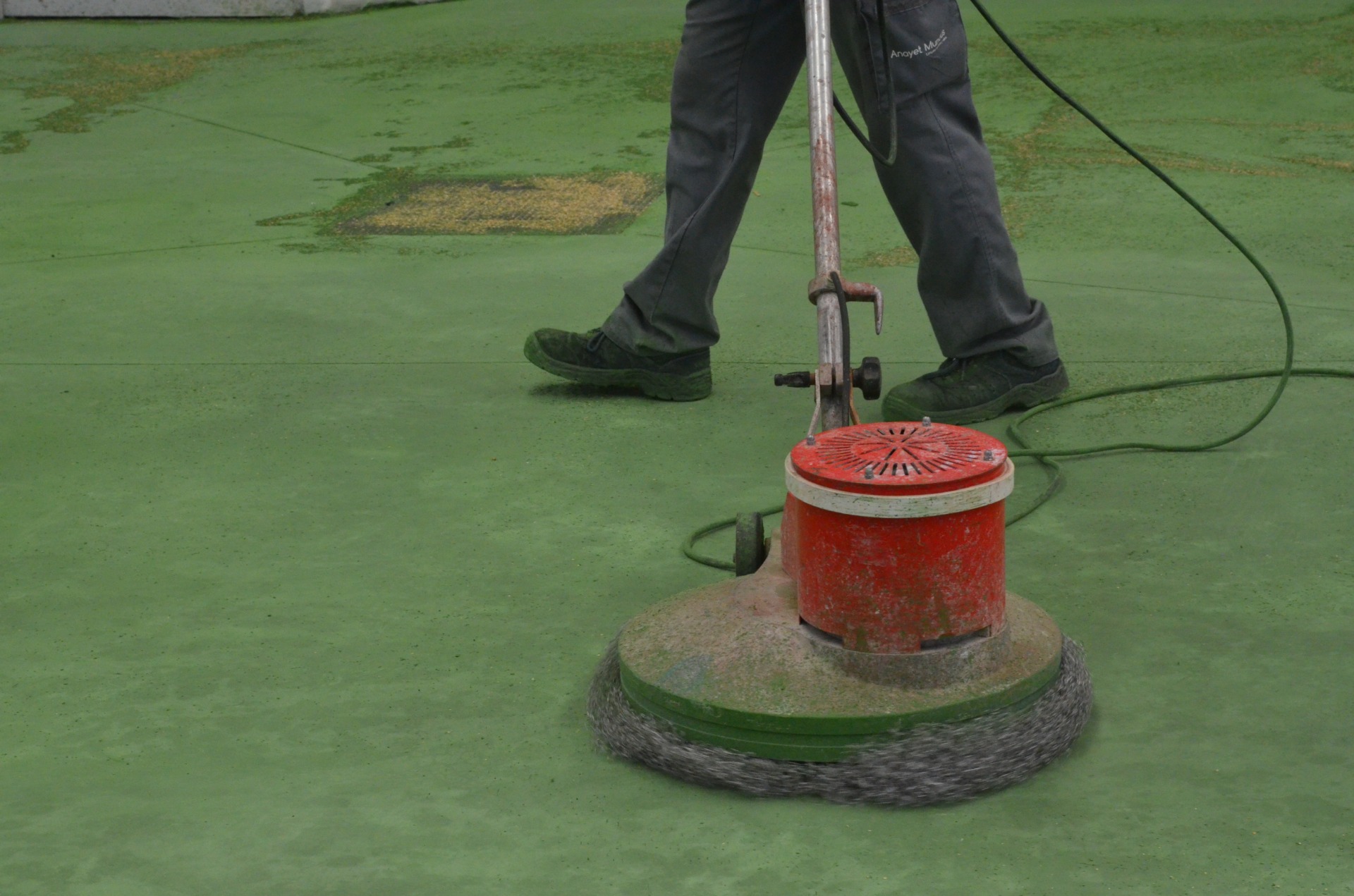 Empezamos el proceso realizando un depurado de la solera. Eliminamos las manchas previas, las rodadas.